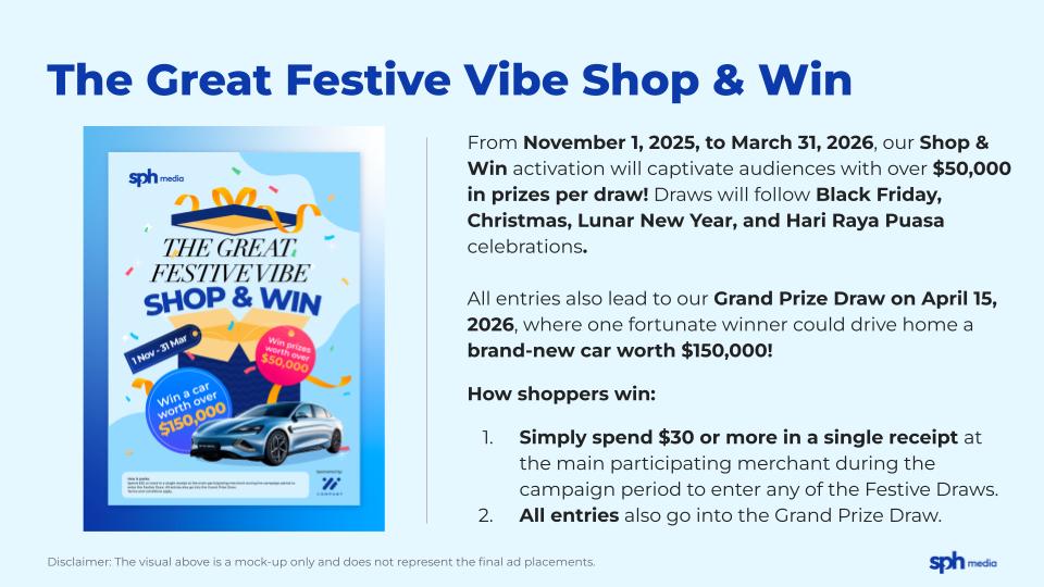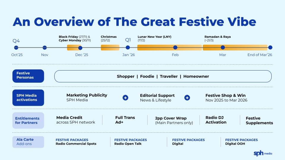 Ignite your festive campaign with SPH Media. Don't miss this chance to become part of the season's biggest celebrations and drive meaningful results for your business.