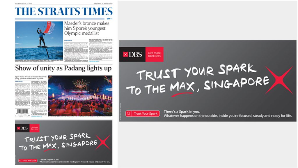 Riffing off its regional brand campaign tagline, “Trust Your Spark”, the bank sent an inspiring message to the country with the line, “Trust your spark to the max, Singapore”.
