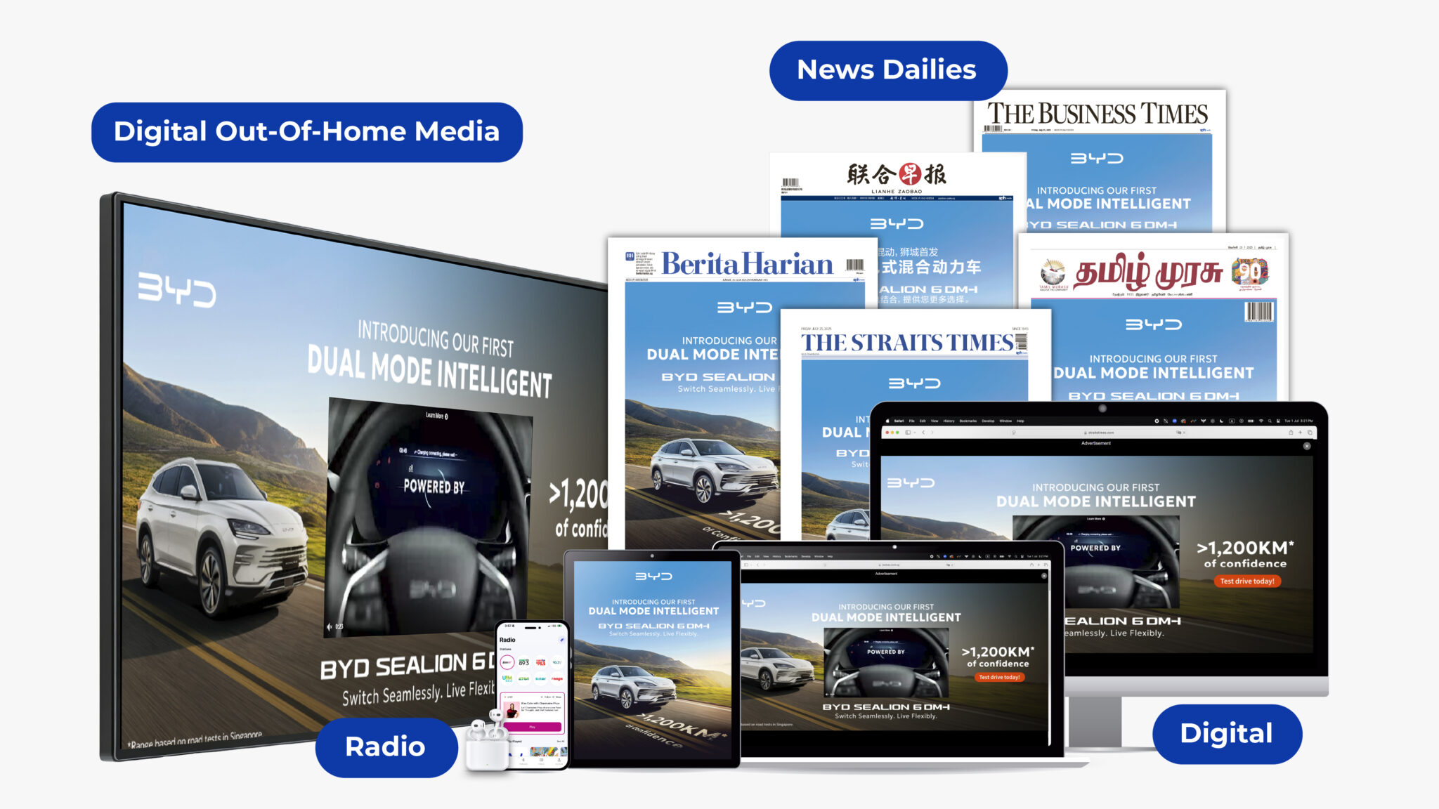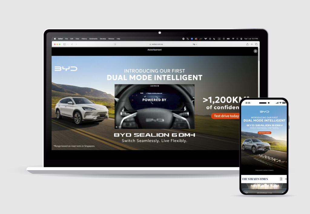 Strategic omnichannel saturation: We executed a comprehensive media strategy that spanned print, digital, radio, and Digital Out-of-Home (DOOH) platforms. By taking over key media channels for a full day, we ensured the BYD SEALION 6 DM-i was unmissable to audiences across Singapore.